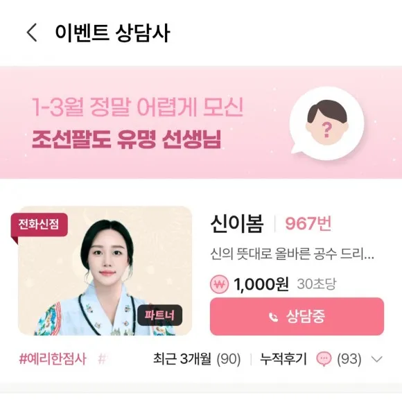 정체되었던 운의 흐름이 본격적으로 움직이기 시작하는 때입니다. 웅크려 있던 마음의 짐은 내려놓고, 새로운 기운을 가득 채우실 수 있도록 정성을 다해 상담하겠습니다🙏