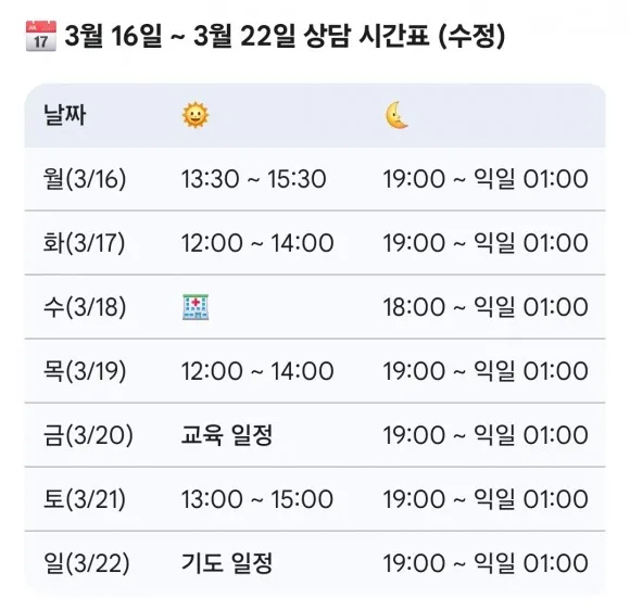 ▪︎매달 기도일정으로 상담 휴무가 2-3일정도 있습니다. 추후 미리 공지하겠습니다!