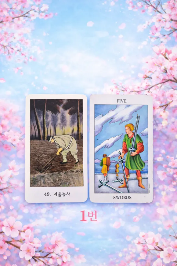 지금 관계에서 한쪽이 더 많이 참고 끌고 가는 흐름이 강하게 보입니다. 겨울농사 카드처럼 결과 없이 계속 노력만 이어지는 모습이 나타나요. 소드5 카드도 함께 나와 감정적으로 상처나 손해를 보고 있을 가능성이 큽니다.