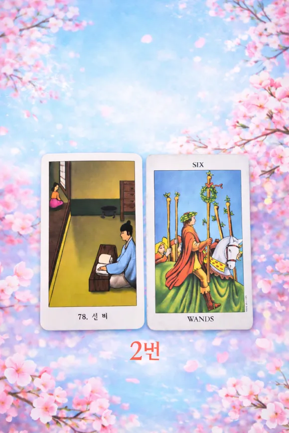 완드6 카드가 함께 나와, 이 관계를 이어가고 싶은 마음 자체는 분명히 있습니다. 다만 서로 인정받고 싶은 마음만 있고, 실제 행동이나 표현은 부족한 상태입니다.