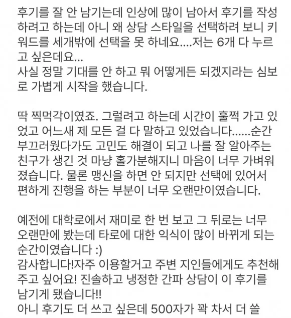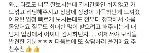 ※ 타고난 직관력이 강해서 무속인분들 포함 저에게만 타로 본다는 말, 결국 다 맞았다는 말, 카드가 너무 정확하게 뽑힌다. 황금손 이네요. 많이 듣습니다. 다 보여드리긴 무리라 일부 상담 후기입니다🙏