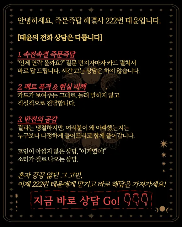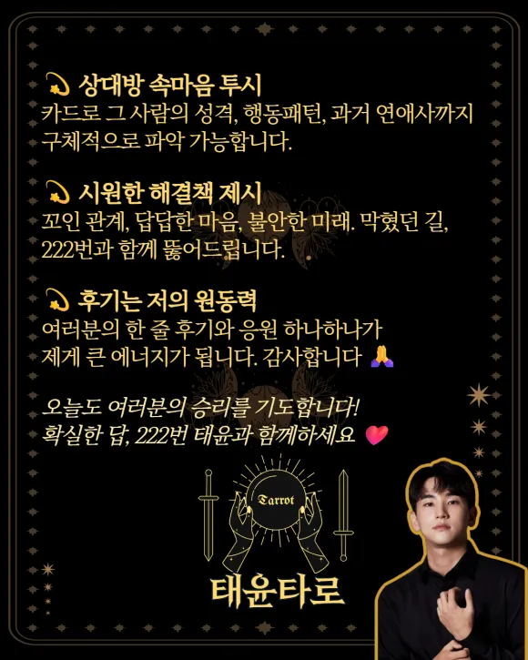 말로 하기 힘든 미묘한 감정의 결을 카드로 읽어내어, 눈에 보이는 텍스트로 명확히 박아드립니다.